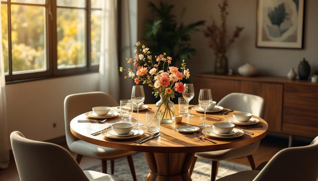 La flexibilité d’une table ronde extensible en fait un choix judicieux pour divers usages. Que ce soit pour un repas quotidien, une réception ou une fête, elle s’adapte aisément à chaque occasion. Son design intemporel et sa variété de matériaux, comme le bois massif ou le verre, permettent de l’intégrer harmonieusement dans tous les styles d’intérieur, qu’il soit contemporain ou scandinave. En ajoutant des bancs incurvés ou des chaises rondes, il est possible de créer une configuration unique qui répond parfaitement aux besoins de chaque événement.